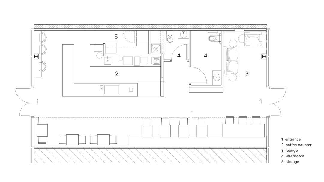 Two distinct zones, one for the serving facilities, the other envisioned to showcase cafe artwork, played a crucial role in defining and enhancing the equally important contributions of community-based artists alongside the cafes’ educational artwork. Seating was strategically arranged along the lengthy art wall section to encourage and deepen visitor engagement with the pieces displayed. Meanwhile, the cafe counter and its supporting spaces were deliberately positioned opposite this art wall/seating area, featuring a carefully curated assortment of educational coffee-related artwork that complements the overall experience. The main central corridor of reflective concrete runs between these two spaces, linking both entrances and facilitated smooth circulation through the space while helping to draw natural light deeper in.