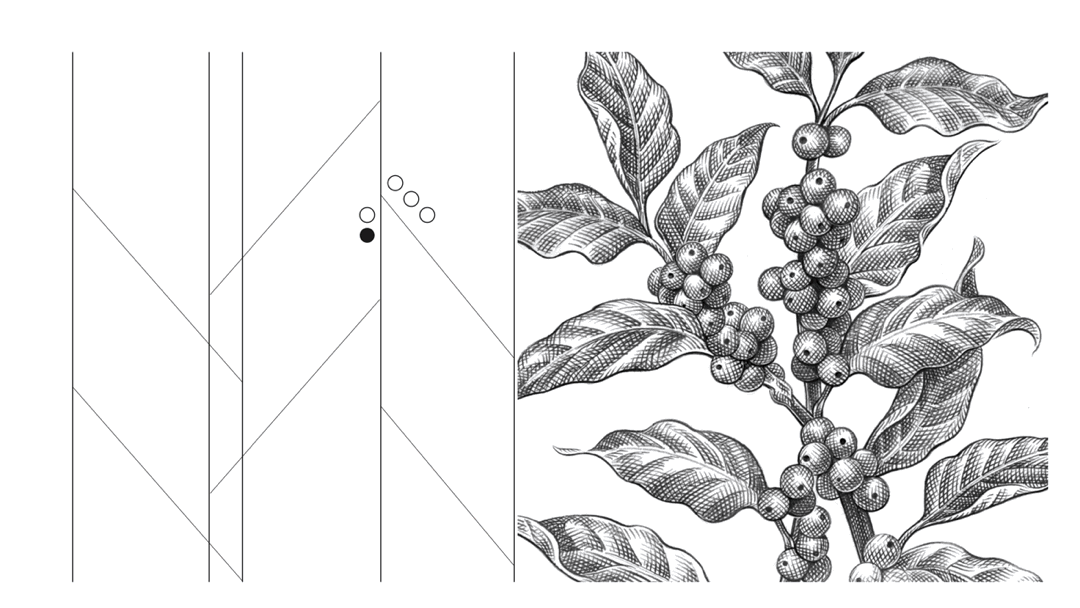 The structure of the coffee plant, from stem to flower to bean weaves through the design in stylised geometric plant motifs.