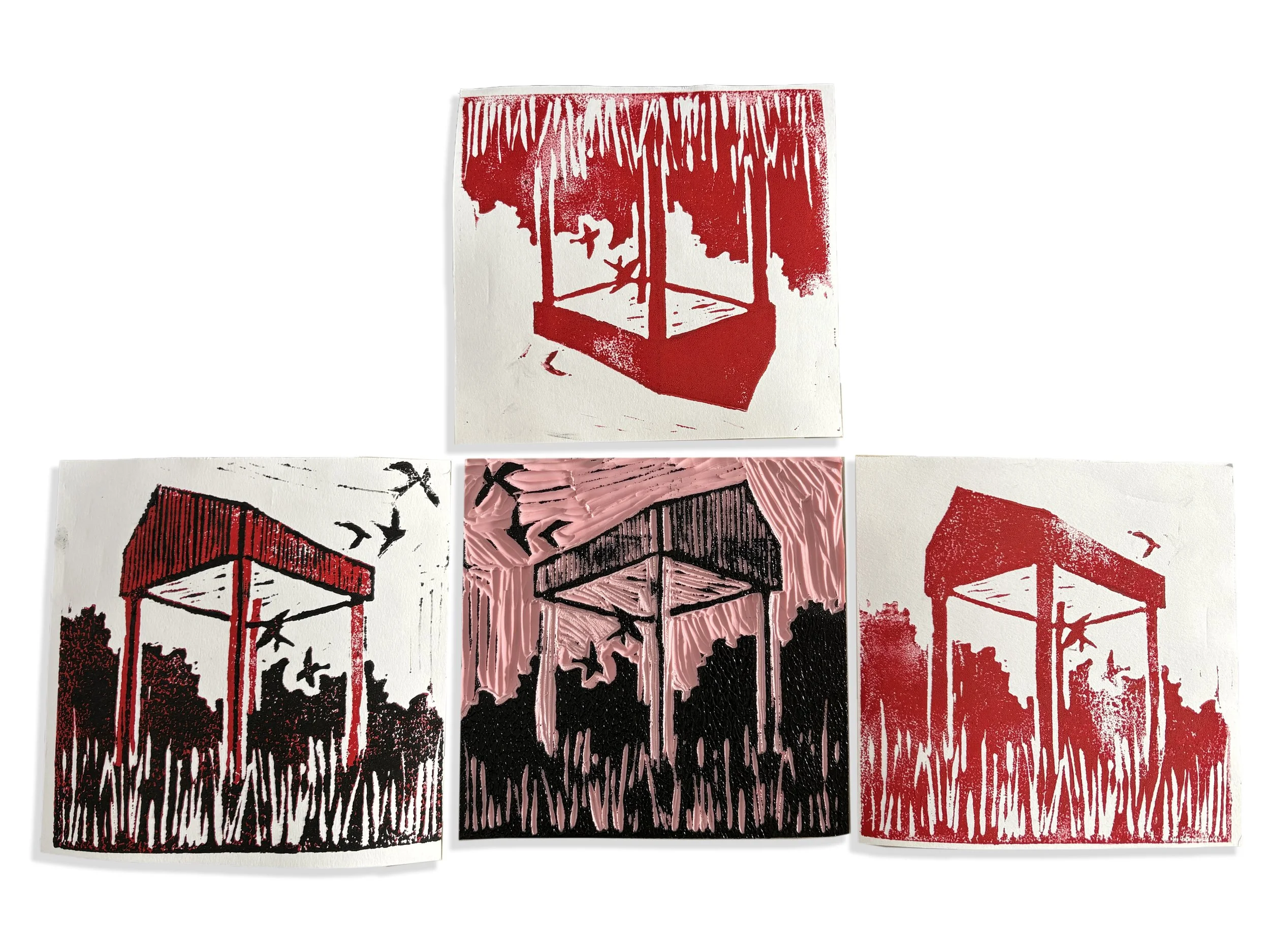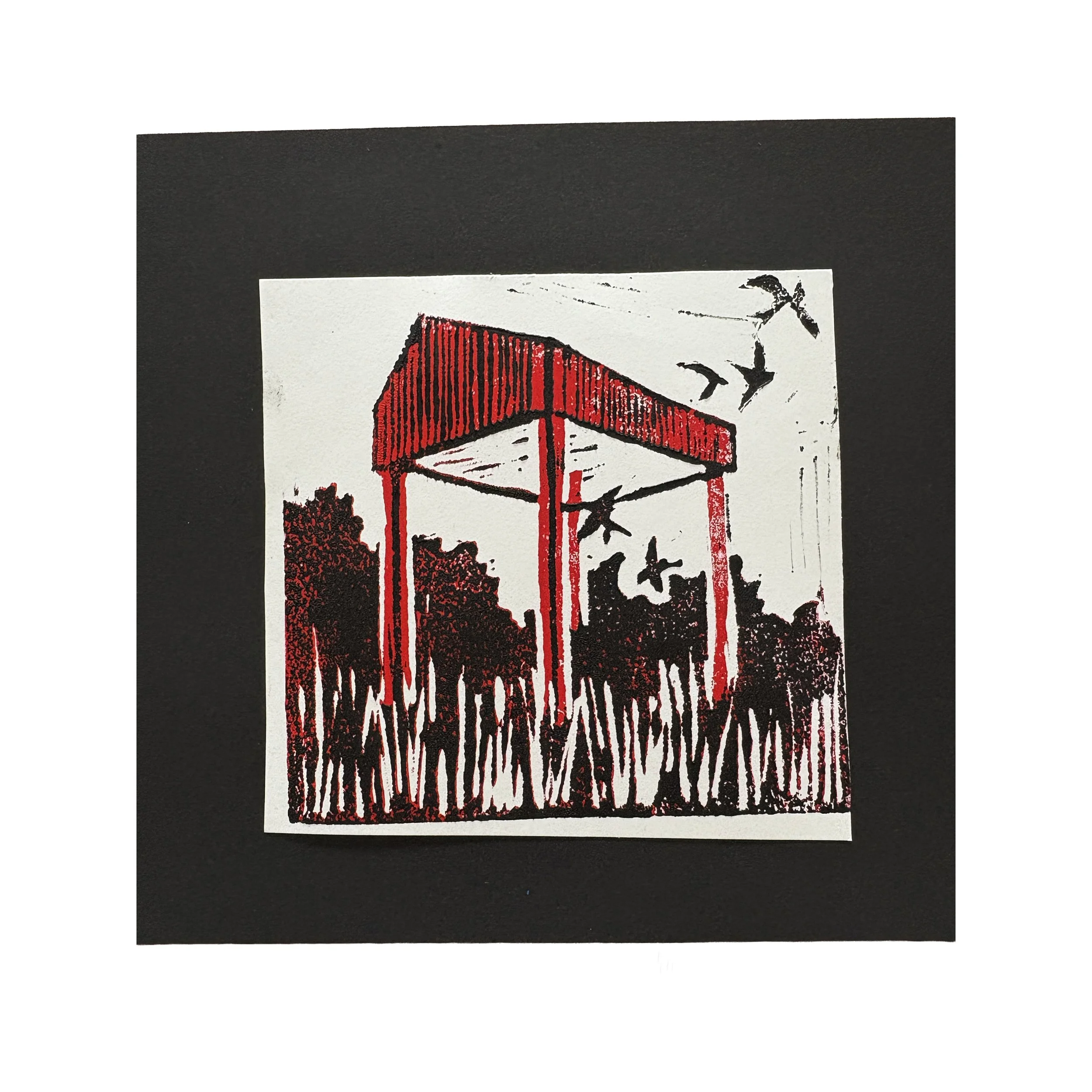 A recent architectural project provided Gina from These Architects with the inspiration for a linocut study—a printmaking technique in which a design is carved into a sheet of linoleum, inked with a roller, and pressed onto paper or fabric. The Swallow House is a thoughtfully designed refuge for a soon-to-be displaced flight (the name for a group of swallows) of barn swallows currently inhabiting a structurally unsound outbuilding on a farm in southern Ontario. Their relocation to this new habitat will provide a more appropriately sited location in which these swallows can thrive.