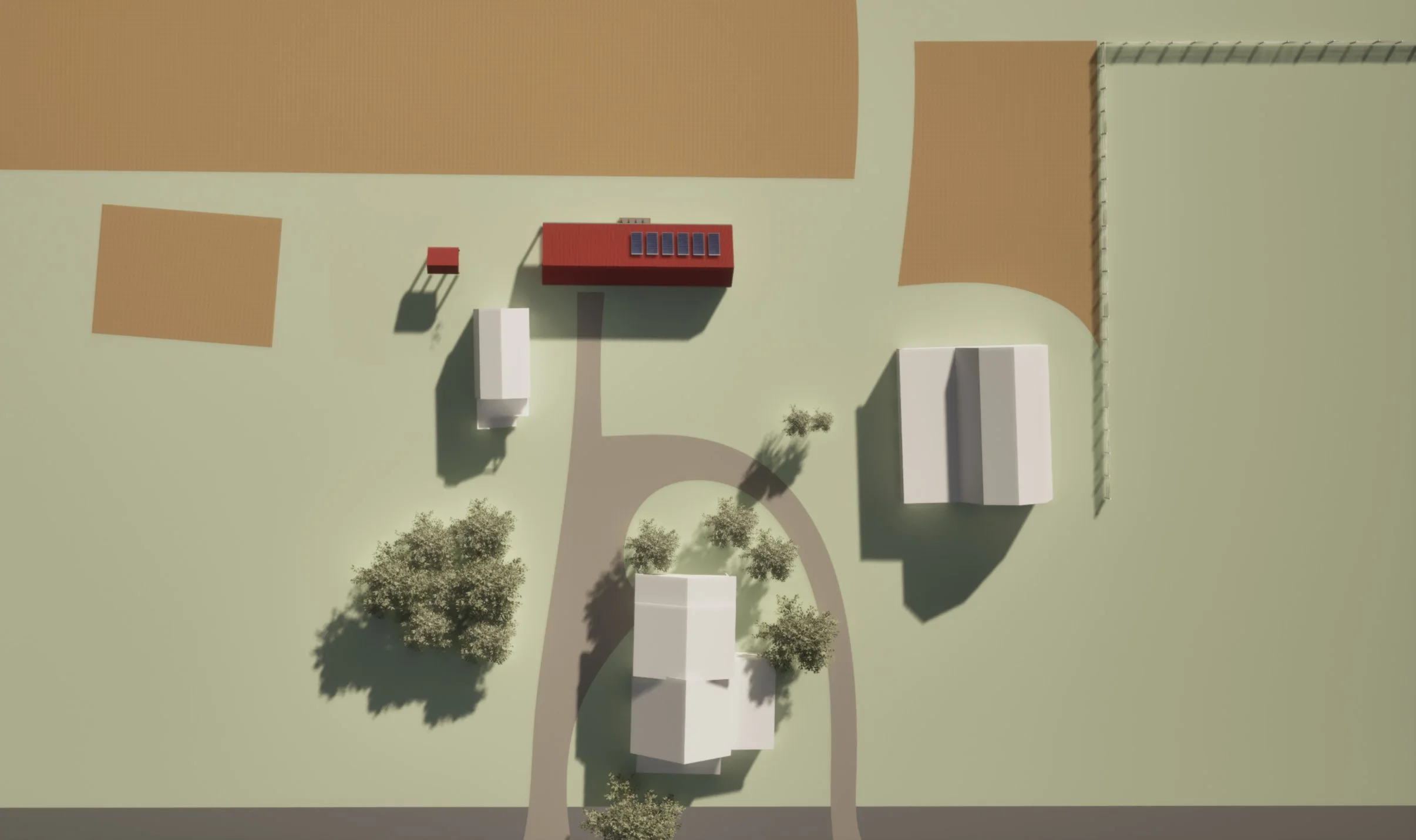 Wrapped in red metal siding and lifted on red-stained wood supports, the structure echoes the material language of the larger redesigned farm building nearby. Set in careful proximity, it sustains a quiet visual dialogue while remaining at a safe, undisturbed distance.